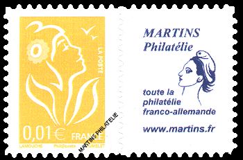 Marianne de Lamouche : 0.01 € jaune, timbre autocollant, avec couche de vernis et signature 'phil@poste' tenant à vignette personnalisée (photo-vignette non-contractuelle)