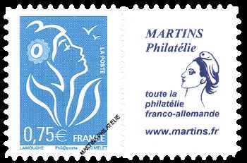 Marianne de Lamouche : 0.75 € bleu clair, timbre autocollant, avec couche de vernis et signature 'phil@poste' tenant à vignette personnalisée (photo-vignette non-contractuelle)